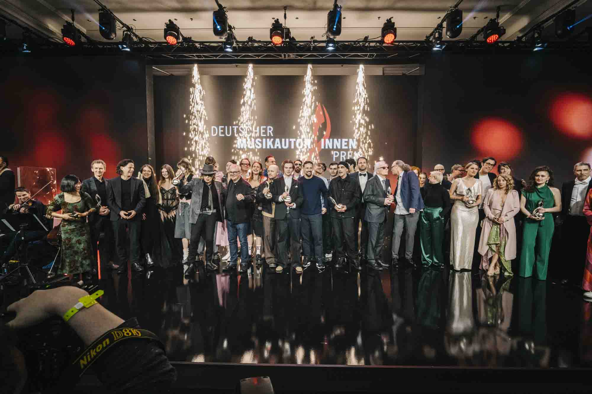 Die festliche Verleihung des Deutschen Musikautor*innenpreises zog auch in diesem Jahr zahlreiche namhafte Musikschaffende und Branchengrößen an. Überreicht wurden die Preisskulpturen von prominenten Laudator*innen, darunter der Schauspieler Joachim Król, die Regisseurin Nora Fingscheidt, die Rapperin Ikkimel sowie Alec Völkel und Sascha Vollmer von der Band The BossHoss. Zu den Gästen gehörten am Donnerstagabend u.a. Álvaro Soler, Ski Aggu, Rolf Zukowski, Sven Regener, Johannes Strate, Leslie Clio, Balbina und Jennifer Weist. Musikalisch begleitet wurde die Verleihung durch eine Showband rund um den Pianisten und Bandleader Lillo Scrimali (The Voice of Germany) auf der DMAP-Bühne. Live-Auftritte von Lisa Morgenstern, Dominik Hartz, Nina Gurol sowie Elif und Lara Hulo rundeten den Abend ab.